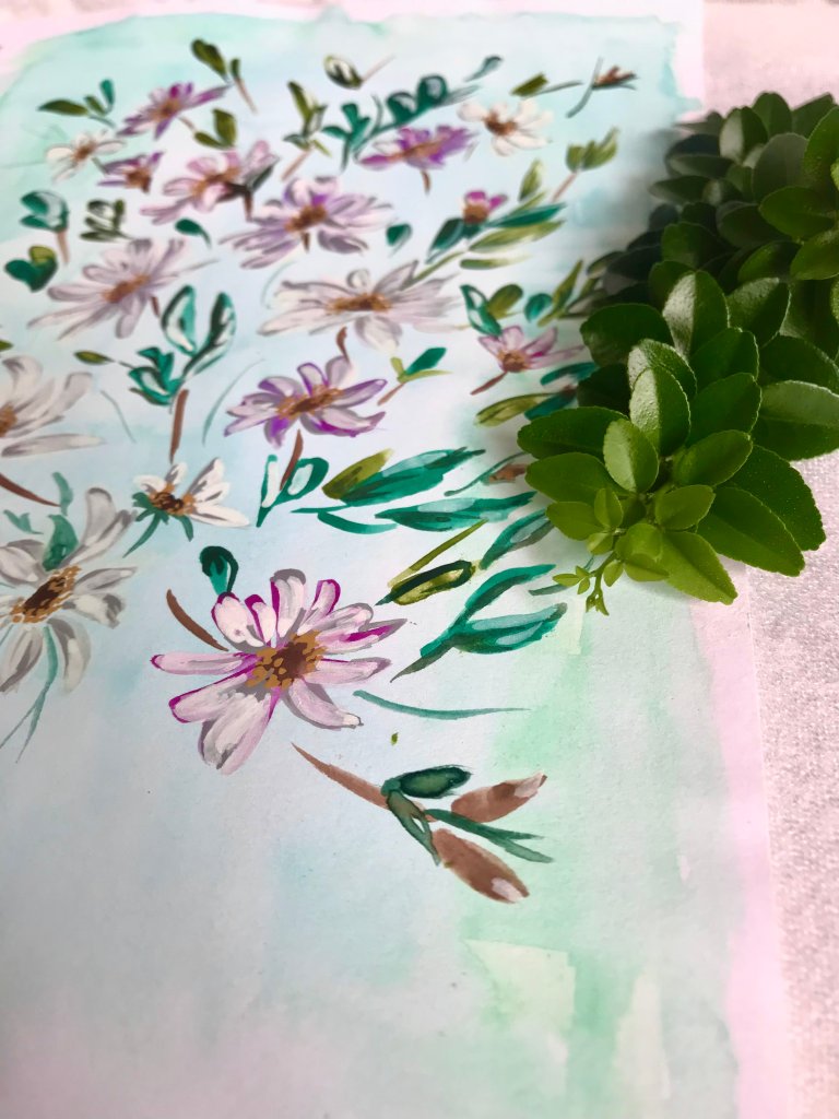 Materials used are all watercolours on paper. I am emphasising the shade of Teal blue along with the flowers that flowed out of my hands. The originals are ready to be framed and hung in their new homes. I proudly present to you…
